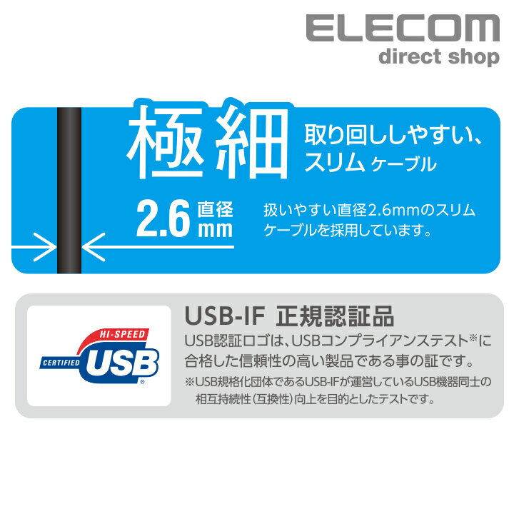 ■コネクタ形状:USB2.0 Standard-Aオス-USB Type-Cオス■対応機種:USB Standard-A端子搭載のパソコン・充電器・モバイルバッテリーおよび、USB Type-C端子搭載のスマートフォン・タブレットなど■ケーブル長:2.0m ※コネクタ含まず■ケーブル太さ:2.8mm■規格:USB2.0規格正規認証品■対応転送速度:最大480Mbps ※理論値■プラグメッキ仕様:金メッキピン■シールド方法:2重シールド■ツイストペアケーブル(通信線):○■カラー:ブラック■パッケージ形態:PET箱+紙台紙エレコムダイレクトショップメーカー希望小売価格はメーカーサイトに基づいて掲載しています。