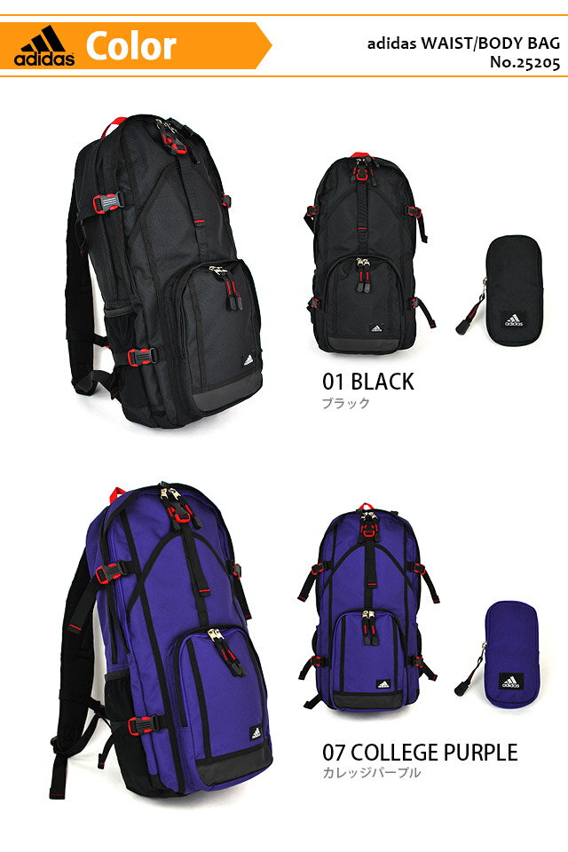 adidas material : ポリエステル color : 01:ブラック・07:カレッジパープル・13:カレッジゴールド size : 幅27cm 高さ52cm 厚み10cm ・前面ファスナーポケット×2・差込ポケット ・メインルーム 差込ポケット・ファスナーポケット ・肩紐に携帯・小物ケース装着 ・肩紐の最大長さ 95cm